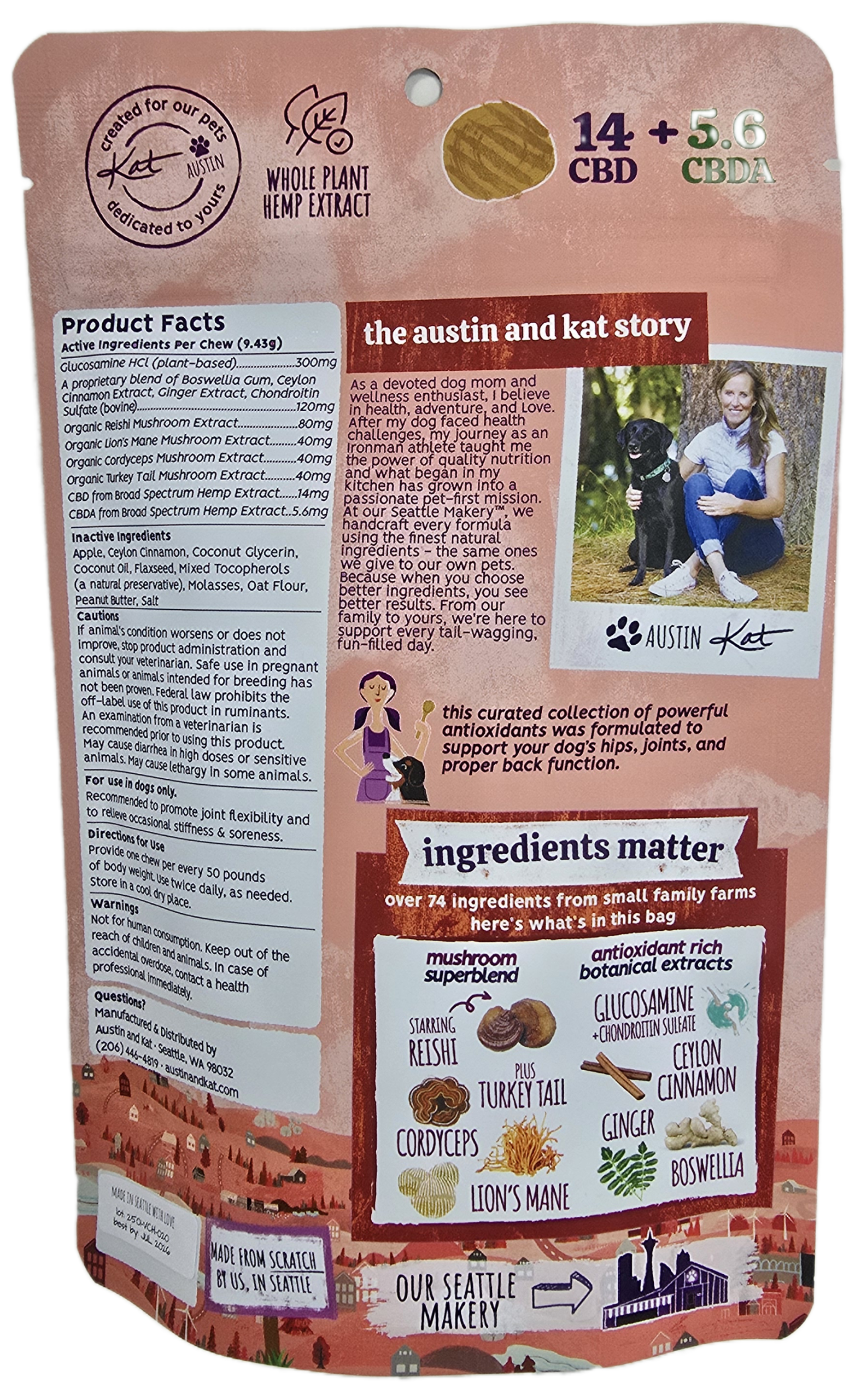 Give your pup the daily support they need to stay active and mobile with Austin and Kat’s specially formulated hip, joint, and back supplement for dogs. Designed with a powerful blend of mobility-enhancing ingredients, this formula targets stiffness, discomfort, and age-related joint issues to help your dog move freely and comfortably.