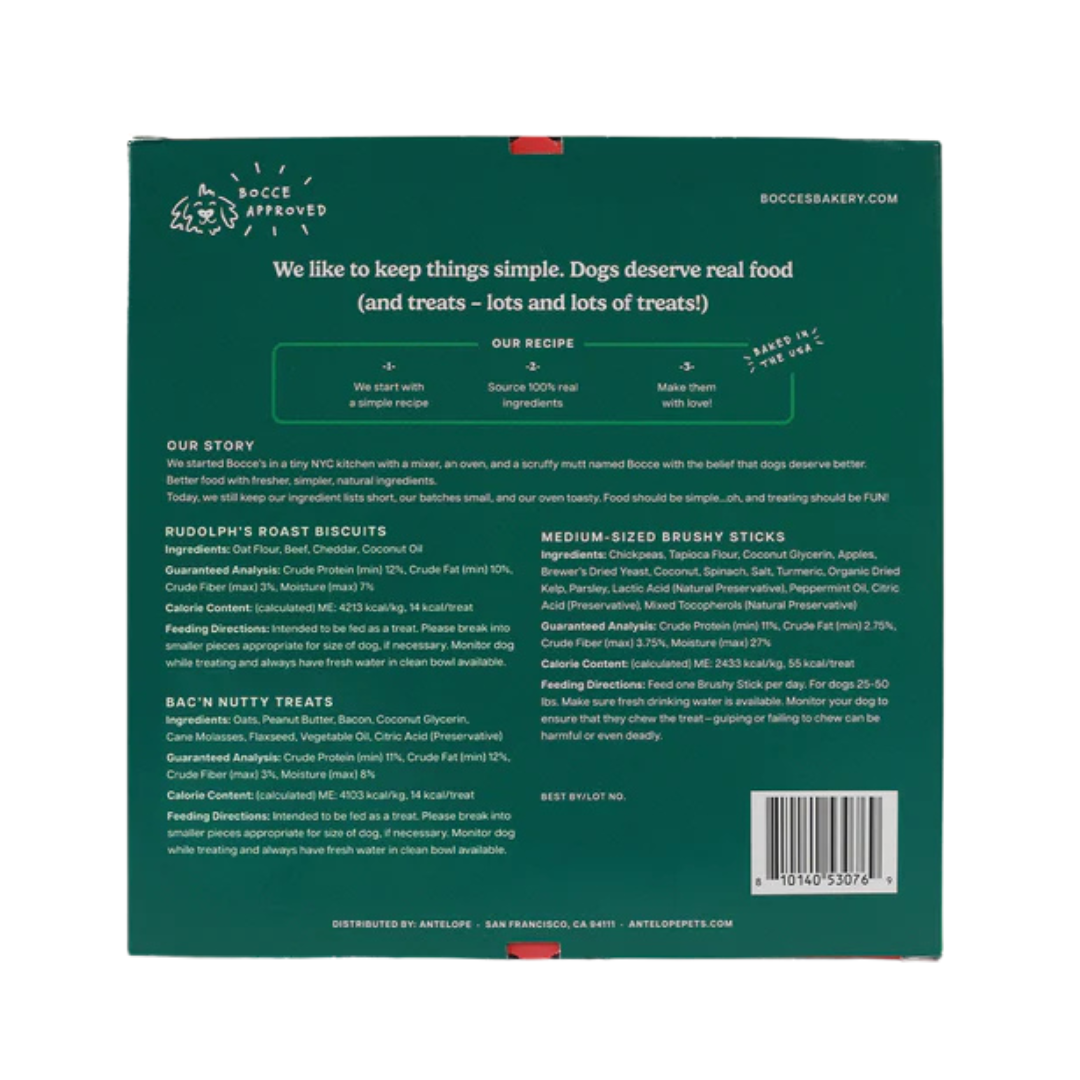 It’s that time of year. Count down the days until your pup sees Santa Paws with Bocce’s Bakery 12-Day Advent Calendar Dog Treats, filled with minty brushy sticks and two tasty biscuit flavors. A fun way to treat your pet!