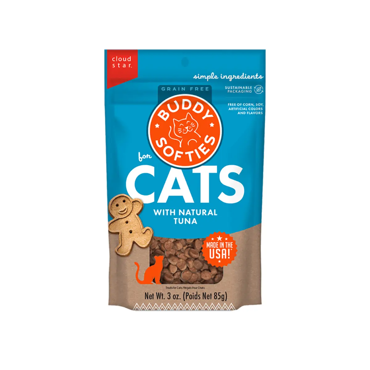Buddy Biscuits Grain Free soft and chewy Tuna cat treats- Now feline friends have their very own Buddy Biscuits to love. These all natural cat treats are made from the finest premium ingredients like real meat and wholesome vegetables with no grains or artificial flavors. These tender little morsels have an enticing aroma and irresistible flavor that cats will crave. 100% Grain Free and Gluten Free. Made with Premium Meats and Vegetables. No Corn Wheat Soy or Eggs. Low in Fat. Made in USA-Resealable 3 oz. package