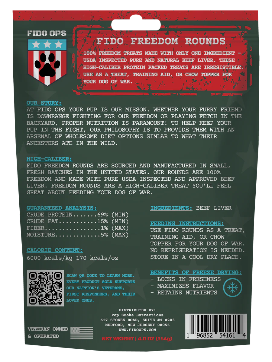 FIDO OPS Freedom Rounds Freeze-Dried Beef Liver Dog Treats are made from all-natural beef liver freeze dried in small batches to keep the nutrients and taste intact for your dog of war. They are rich in protein, amino acids, iron, and B vitamins which will assist your dog in battle. These single ingredient, gluten free, grain free, sourced in and MADE IN USA treats are ideal for dogs with allergies or who follow a limited ingredient diet. Free from chemicals, additives, and preservatives. Fido Ops guarantees that all ingredients are 100% traceable and confirms that they are sourced and packaged in the United States.