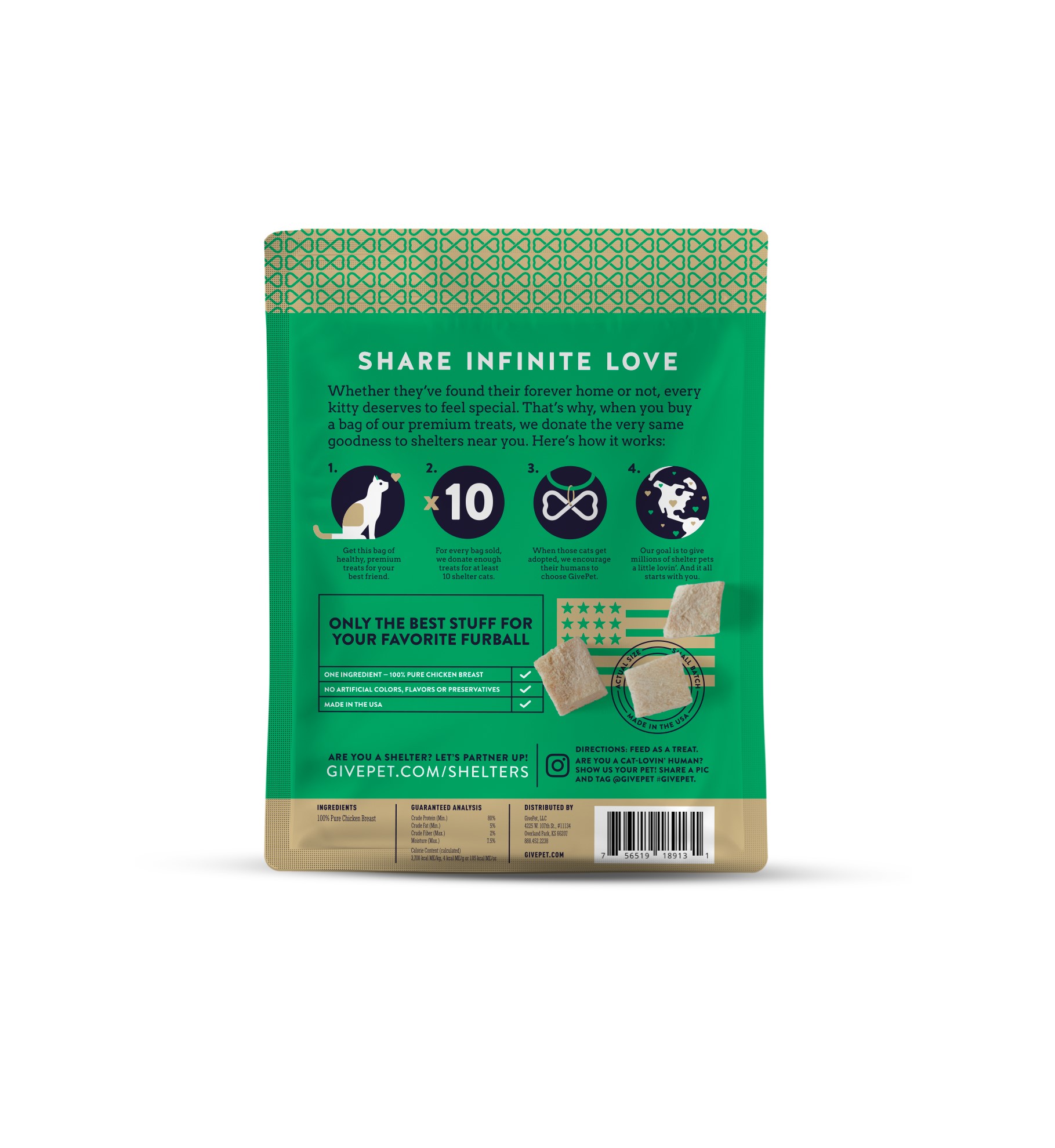 GivePet Meowsterpiece Cat Treats is 1.25oz bag of freeze-dried cat treats with one ingredient – 100% pure chicken breast. Designed for even the most finicky of cats! Made in the USA with no artificial ingredients, flavors or preservatives.