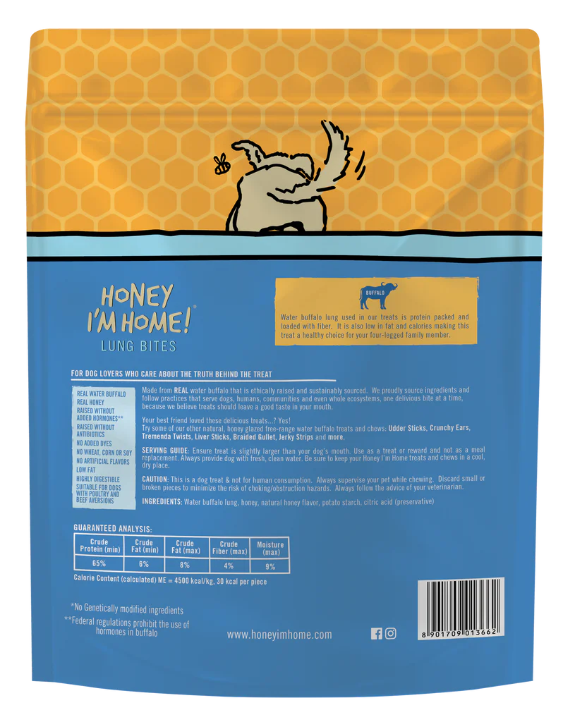 Reward your pup with the tail-wagging goodness of Honey I’m Home! Buffalo Lung Bites Dog Treats! They are crunchy, protein-rich dog treats made from grass-fed, free-range buffalo lung, lightly coated with natural honey for a sweet and savory flavor dogs love.