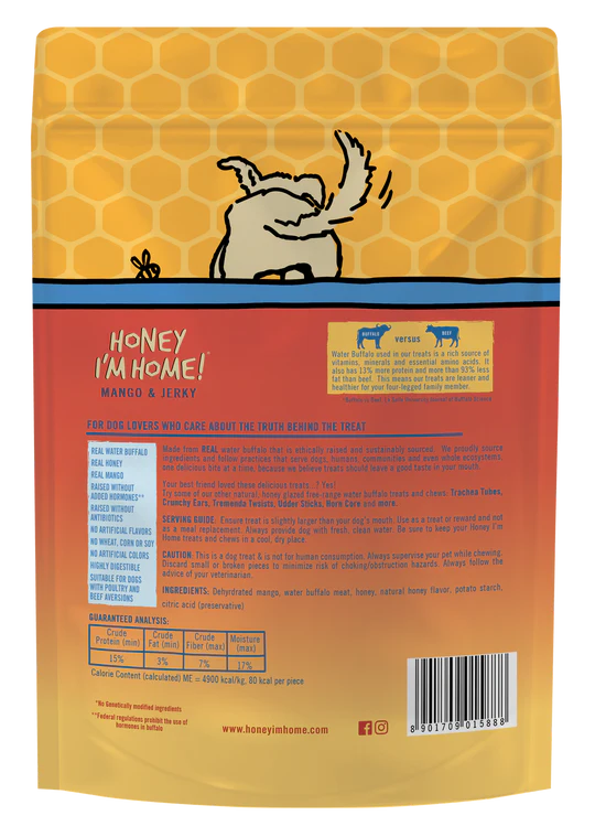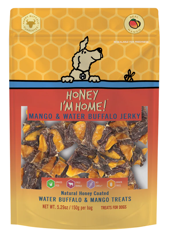 Treat your furry friend to something fruity with Honey I’m Home! Mango & Water Buffalo Jerky Dog Treats. These tropical treats are made from dehydrated mango and delicious buffalo jerky, all dipped in honey for a mouthwateringly grr-eat taste! Only grass-fed, free-range buffalo meat goes into these treats, with no grain or GMOs anywhere in the recipe. They’re high in protein, low in fat and made with naturally nutritious ingredients, so these sweet and savory mango jerky snacks will have even the pickiest dogs begging for more!