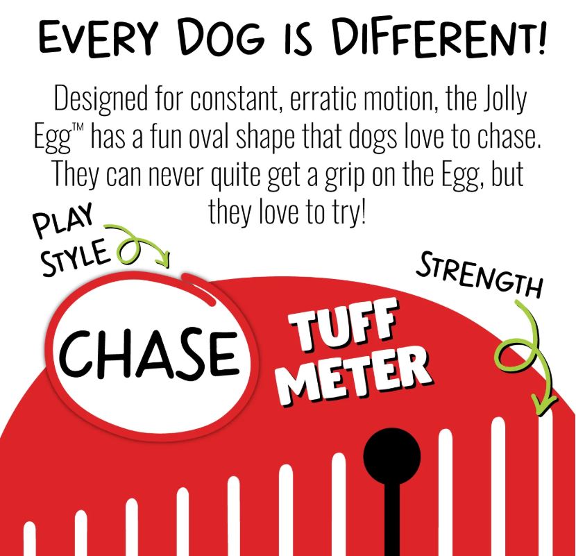 Designed for constant, erratic motion, the Jolly Egg has a fun oval shape that dogs love to chase. These egg shaped balls really get dogs moving and now little dogs can exercise too! The shape of the egg ball makes it shoot away when your dog tries to grab it, then the chase is on.They can never quite get a grip on the Egg, but they love to try! Since the toy constantly escapes your dog, it gives your dog a safe, fun outlet for their prey instinct. This is a very sturdy toy and we recommend this for those dogs who seem to destroy everything. This 8″ size is perfect for dogs 40 lbs and under. Comes in yellow or red.