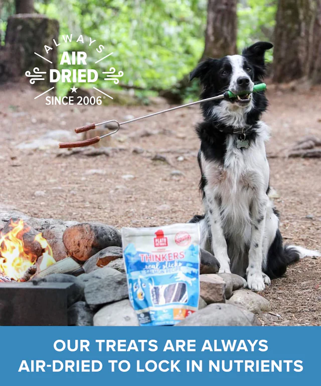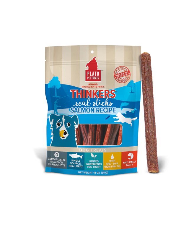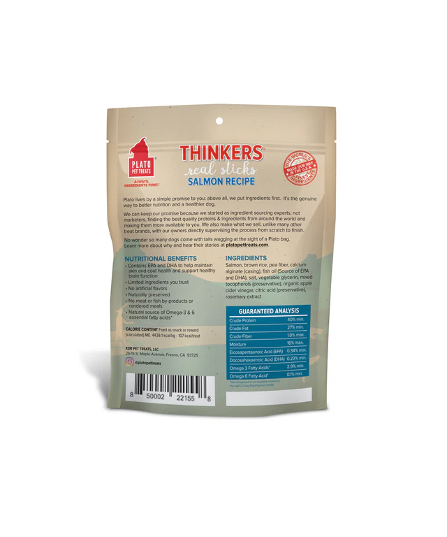The “no brainer” treats for dogs. Thinkers Salmon Sticks are hearty, meat-packed sticks with added EPA and DHA to support healthy brain function and to help maintain skin and coat health. Made with salmon as the 1st ingredient, these treats are made with limited ingredients, are naturally preserved and contain no artificial flavors.